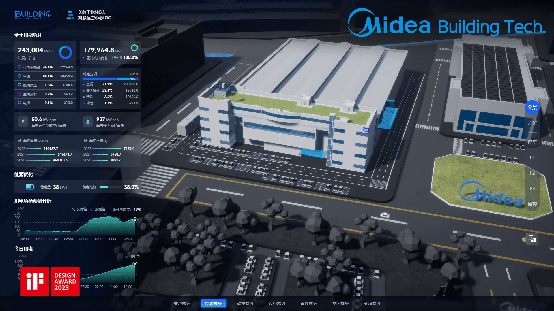 IOC, the intelligent operation center of the West Industrial Park of tMidea, has built a three-dimensional visualization operation center with three-dimensional insight into the building situation and data fusion across business systems. Based on the digital twinning capability of iBUILDING and the efficient docking capability of multi-source data, it has realized the information of important indicators such as energy, carbon emissions, equipment, space and comfort in the park. It can integrate and display information such as real-time warning of important events, multi-dimensional statistics of energy consumption data and real-time analysis of indoor environment, and provide comprehensive solutions and services for intelligent people, vehicles, security, equipment, environment and energy.